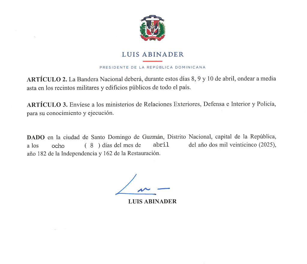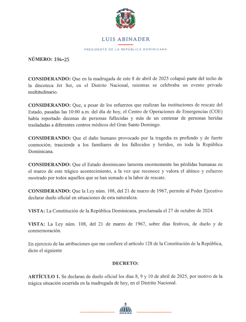 Santo Domingo. – El presidente Luis Abinader declaró mediante 194 – 25 los días 8, 9 y 10 de abril de 2025 de duelo oficial, por motivo de la trágica situación ocurrida en la madrugada de hoy en la discoteca Jet Set, en el Distinto Nacional.